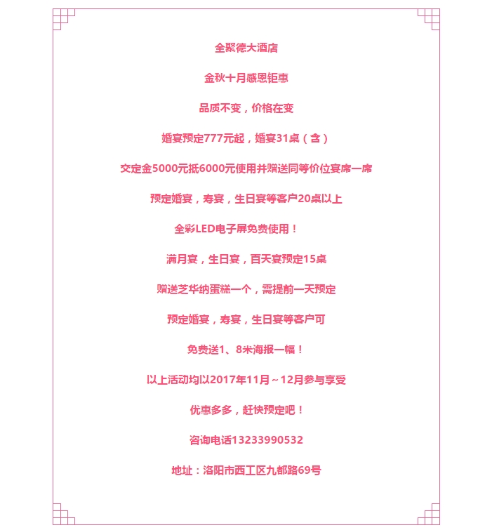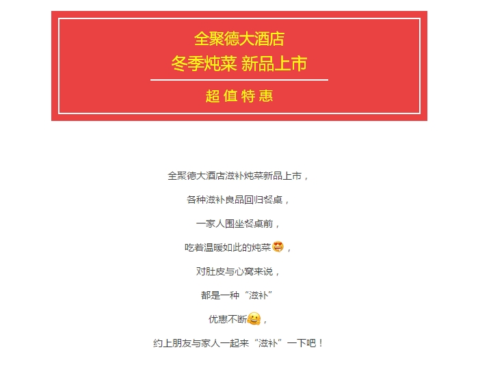 送温暖!全聚德大酒店新品炖菜火热上市 让这个冬天不再寒冷 发布时间:2017-10-28来源:点击:2367 洛阳餐旅 宴会专家全国预订客服热线:400-616-3939微信号:hacyly股票代码:836977长按二维码识别后添加关注以上信息来源于洛阳餐旅集团官网:www.athena-online.com 分享到:0 用手机看 拍下二维码,信息随身看 试试用微信扫一扫,在你手机上继续观看此页面。 上一篇:送温暖!宴天下老城店新品炖菜火热上市 让这个冬天不再寒冷 下一篇:洛阳餐旅集团旗下各店2017年11月-2018年2月可预订宴会日期一览表(10.30更新)
