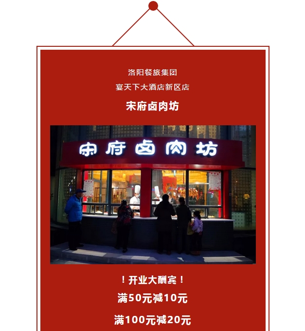 宋府卤肉坊新店开业!满50立减10元 以此类推! 发布时间:2017-11-25来源:点击:2353 洛阳餐旅 宴会专家全国预订客服热线:400-616-3939微信号:hacyly股票代码:836977长按二维码识别后添加关注以上信息来源于洛阳餐旅集团官网:www.athena-online.com 分享到:0 用手机看 拍下二维码,信息随身看 试试用微信扫一扫,在你手机上继续观看此页面。 上一篇:中国收藏家协会副会长许诺军等一行考察洛阳旅发集团旗下华夏喜庆文化博物馆 下一篇:美国中华艺术收藏家协会会长曹鑫参观考察洛阳旅发集团旗下华夏喜庆文化博物馆