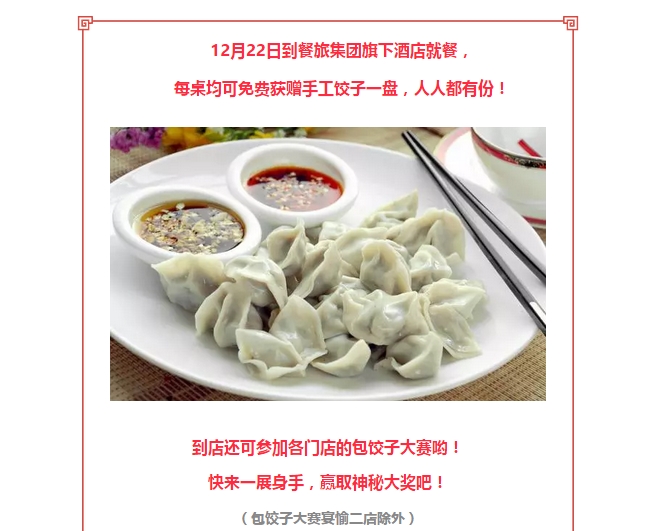 冬至 | 免费手工饺子!更有包饺子大赛赢神秘大奖! 发布时间:2017-12-21来源:点击:2657 洛阳餐旅 宴会专家全国预订客服热线:400-616-3939微信号:hacyly股票代码:836977长按二维码识别后添加关注以上信息来源于洛阳餐旅集团官网:www.athena-online.com 分享到:0 用手机看 拍下二维码,信息随身看 试试用微信扫一扫,在你手机上继续观看此页面。 上一篇:到宴愉洛邑古城店,精品美味天天免费吃! 下一篇:***影视演员李亚鹏参观洛阳旅发集团旗下华夏喜庆文化博物馆