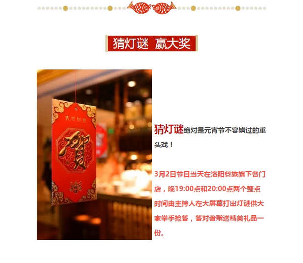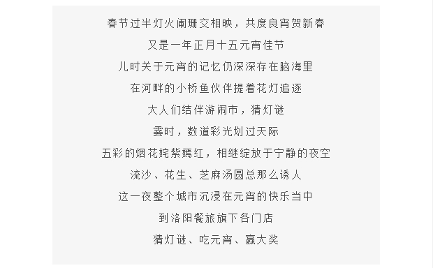 猜灯谜 赢大奖 美味元宵送给您 发布时间:2018-02-26来源:点击:2320 洛阳餐旅 宴会专家全国预订客服热线:400-616-3939微信号:hacyly股票代码:836977长按二维码识别后添加关注以上信息来源于洛阳餐旅集团官网:www.athena-online.com 分享到:0 用手机看 拍下二维码,信息随身看 试试用微信扫一扫,在你手机上继续观看此页面。 上一篇:洛阳餐旅集团诚聘精英 牵手餐旅 共图大业! 下一篇:洛阳全聚德大酒店管理人员到洛阳旅发集团旗下华夏喜庆文化博物馆民间传统喜庆文化展厅参观学习