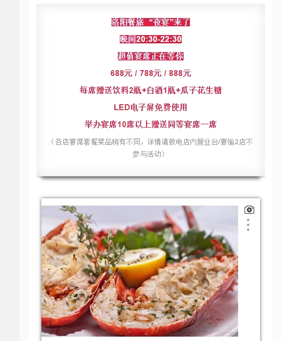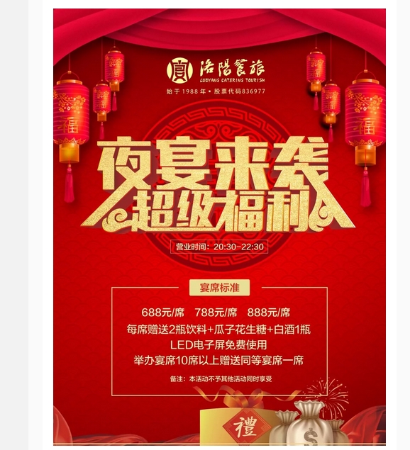 夜宴 | 谁说晚了就吃不到包桌?洛阳餐旅晚间宴席全城钜惠(聚会)! 发布时间:2018-05-06来源:点击:3903 洛阳餐旅 宴会专家全国预订客服热线:400-616-3939微信号:hacyly股票代码:836977长按二维码识别后添加关注以上信息来源于洛阳餐旅集团官网:www.athena-online.com 分享到:0 用手机看 拍下二维码,信息随身看 试试用微信扫一扫,在你手机上继续观看此页面。 上一篇:60天! 幸福新娘决战在即!抓紧上车一起赢取十万大奖! 下一篇:洛阳餐旅旗下各店2018年5月-8月可预订宴会日期一览表(5.7更新)
