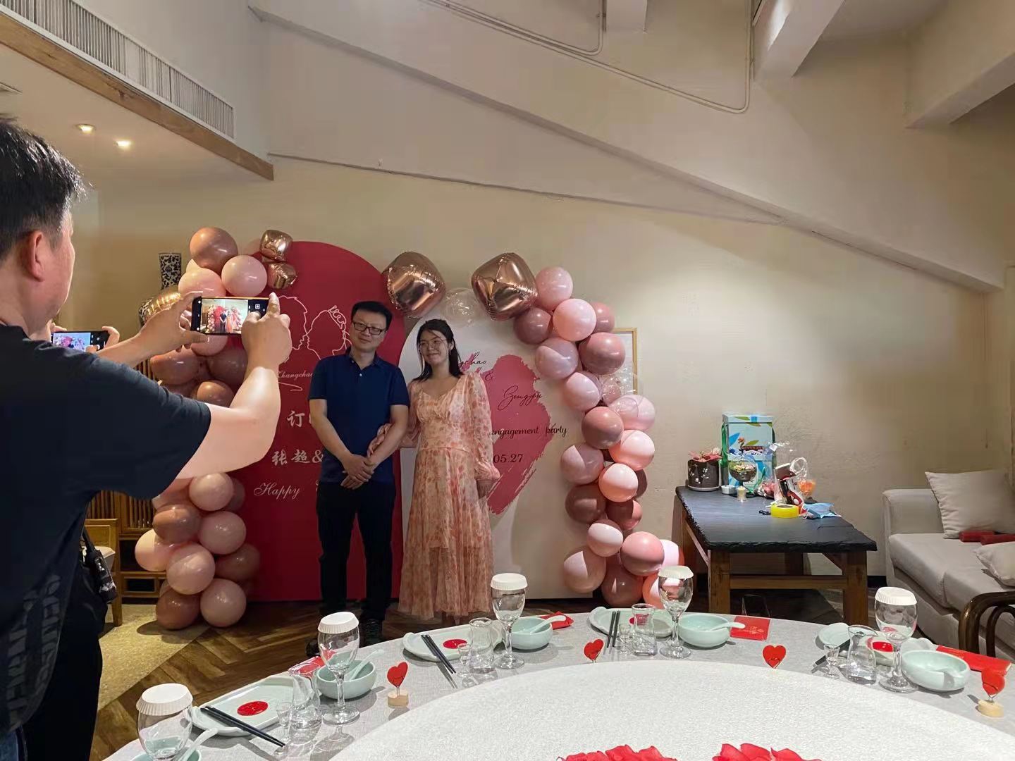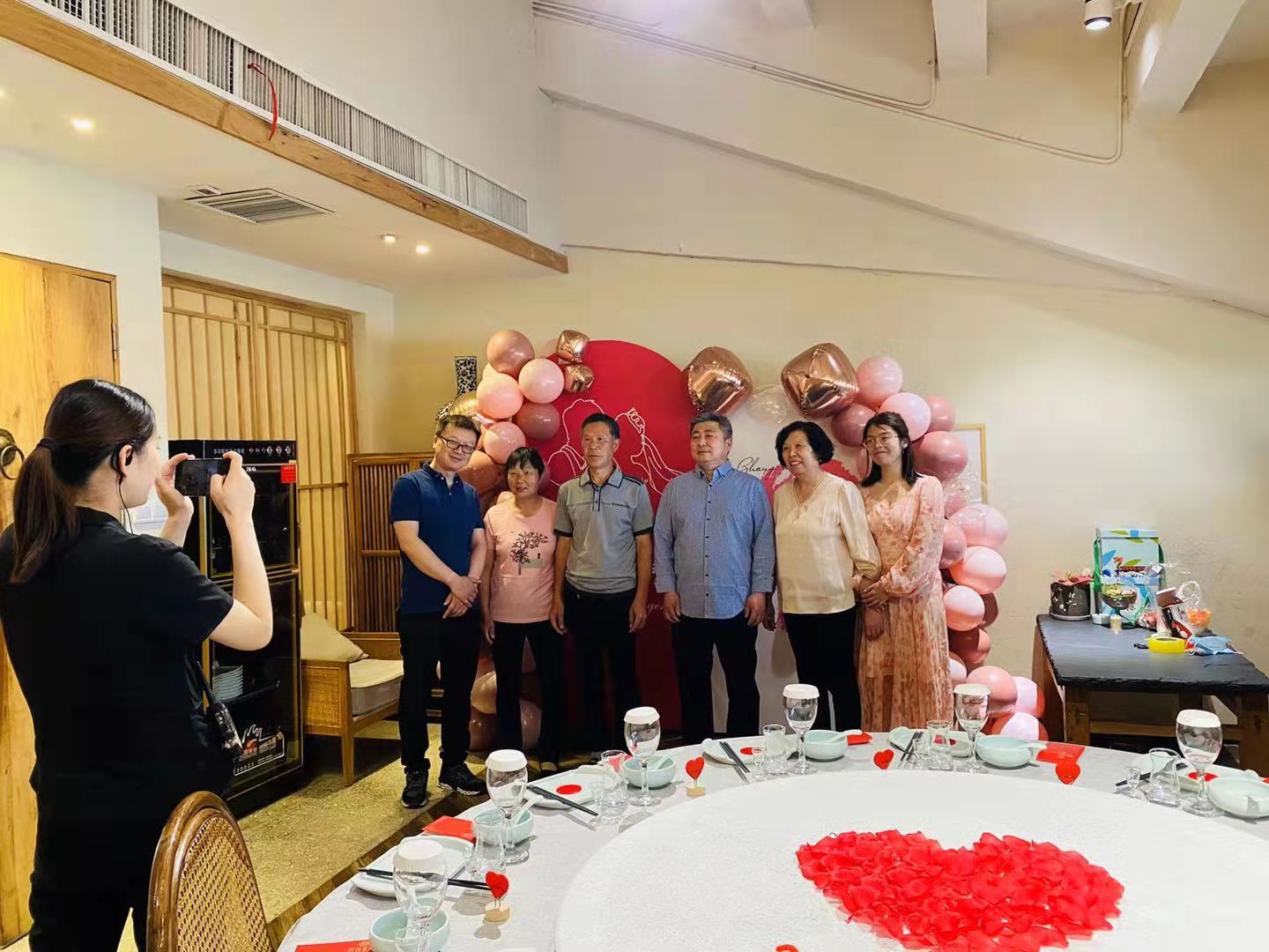 中午11点半的时候一切准备就绪后,主家陆续来到了餐厅,看到我们布置的场景先是感到很意外,接着纷纷拿起手机拍照,并询问这些都是怎样布置出来的。回答完客人的疑问后,有个客人提议要先拍个全家福,于是我就主动去为客人们拍了合影,留下他们重要的幸福瞬间。