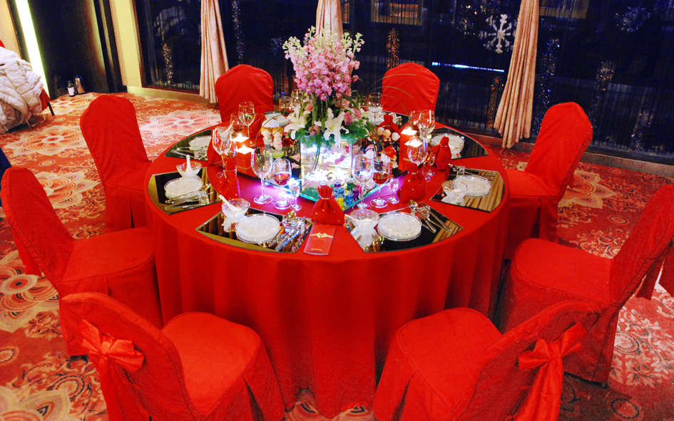 新区店餐台整体以中国红为主要元素,独特的水晶镜面餐台中央摆放着插满紫罗兰与百合的花束,暗香浮动,在荧荧烛火的点缀下,流光溢彩,浪漫温馨。